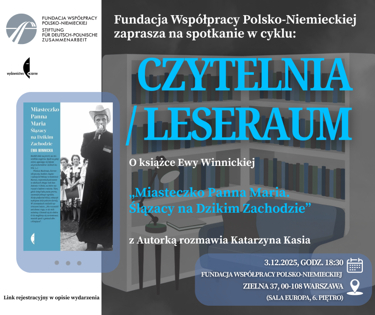 Fundacja Współpracy Polsko-Niemieckiej zaprasza na spotkanie w cyklu CZYTELNIA/LESERAUM/. O książce Ewy Winnickiej "Miasteczko Panna Maria. Ślązacy na Dzikim Zachodzie"…