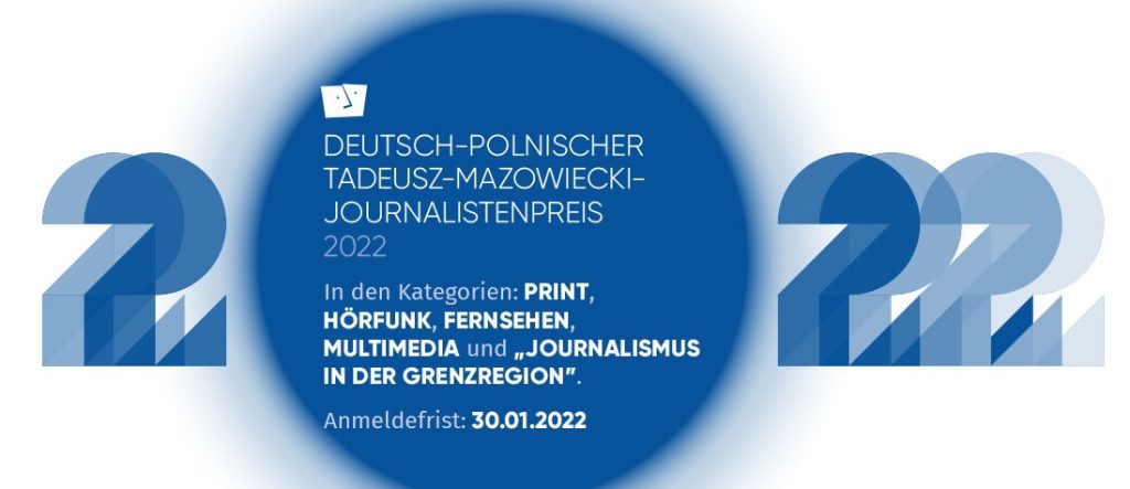 Für den 25. Wettbewerb um den Deutsch-Polnischen Tadeusz-Mazowiecki-Journalistenpreis können nur noch bis zum kommenden Sonntag (30. Januar 2022) Beiträge eingereicht werden. Bewerbungen sind in den Kategorien Print, Hörfunk, Fernsehen, Multimedia und „Journalismus in der Grenzregion“ möglich. Die Preise sind in jeder der fünf ausgelobten Kategorien mit jeweils 5.000 Euro dotiert. Die Siegerinnen und Sieger werden, wenn es die Pandemielage zulässt, bei der Live-Gala am 9. Juni 2022 als Höhepunkt der wieder als Präsenzveranstaltung geplanten Deutsch-Polnischen Medientage in Görlitz/Zgorzelec geehrt.