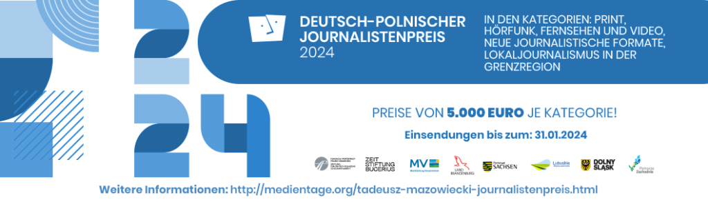 Der Wettbewerb um den Deutsch-Polnischen Tadeusz-Mazowiecki-Journalistenpreis 2024 ist eröffnet. In den Kategorien Print, Hörfunk, Fernsehen und Video, Neue journalistische Formate und Lokaljournalismus in der Grenzregion suchen wir preiswürdige Beiträge. Die Jury entscheidet über die Preise in Höhe von insgesamt 25.000 Euro, die bei einer Gala im Rahmen der Deutsch-Polnischen Medientage am 19. und 20. Juni 2024 in der Universitäts- und Hansestadt Greifswald verliehen werden.