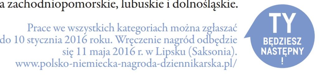 Rozpisano konkurs o XIX Polsko-Niemiecką Nagrodę Dziennikarską im. Tadeusza Mazowieckiego – Wolne Państwo Saksonia ogłasza nagrodę w kategorii „Dziennikarstwo na Pograniczu“ – Termin zgłoszeń: 10 stycznia 2016 roku – Dni Mediów 11 i 12 maja 2016 r. w Lipsku (Saksonia).